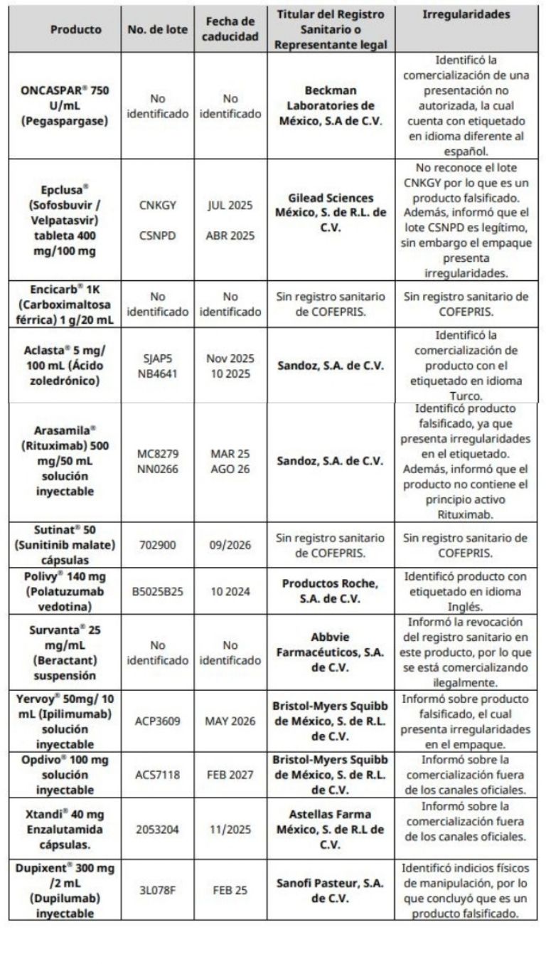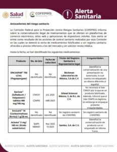 De acuerdo con la autoridad sanitaria federal, la alerta fue emitida como resultado de las acciones de control sanitario mediante las cuales se detectó la venta de medicamentos falsificados o sin registro sanitario, ofrecidos a precios inferiores a los del mercado y sin solicitar receta médica.