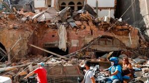 Una columna de humo se eleva desde tanques de combustible en llamas que, según los locales, fueron alcanzados por cinco...